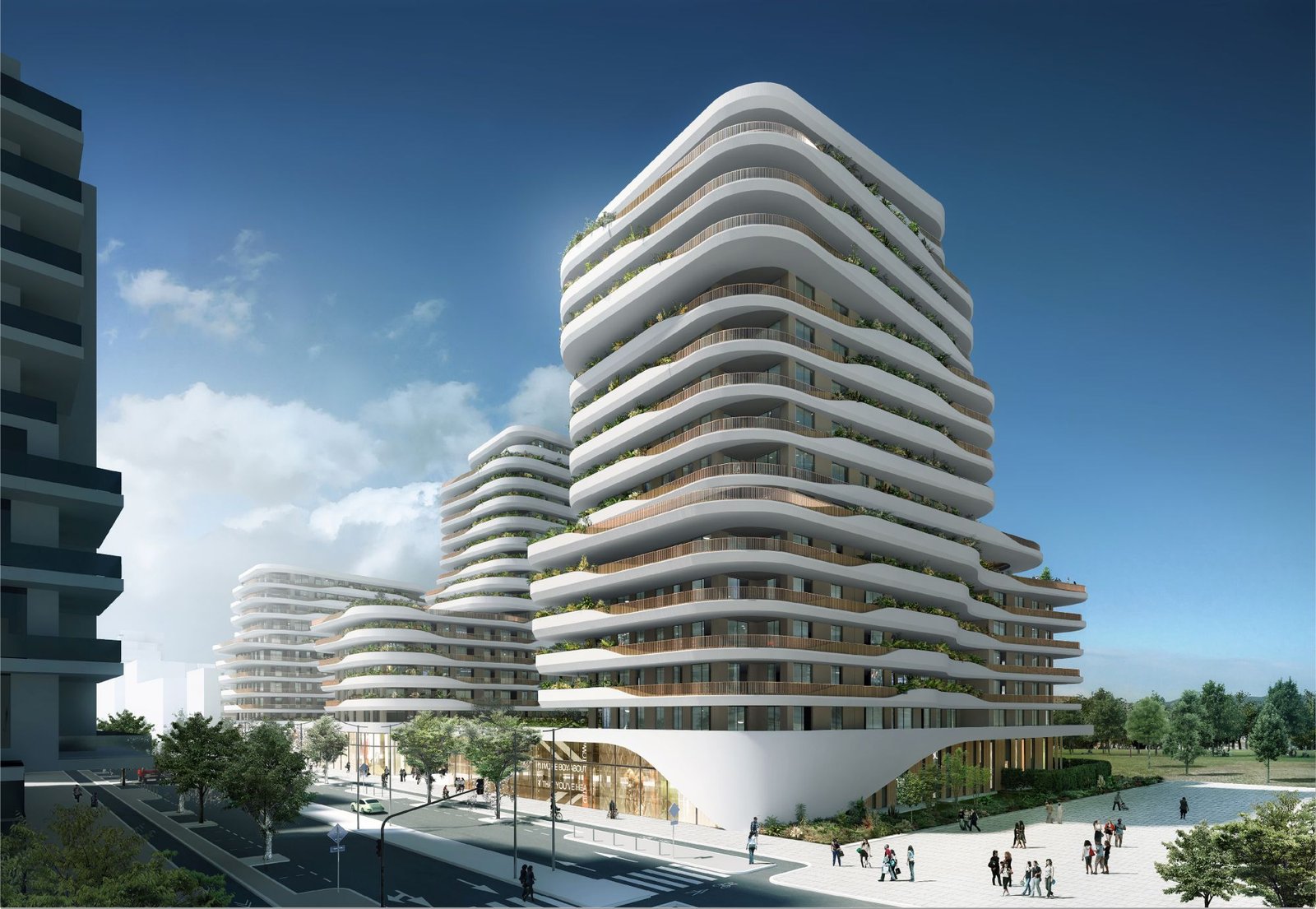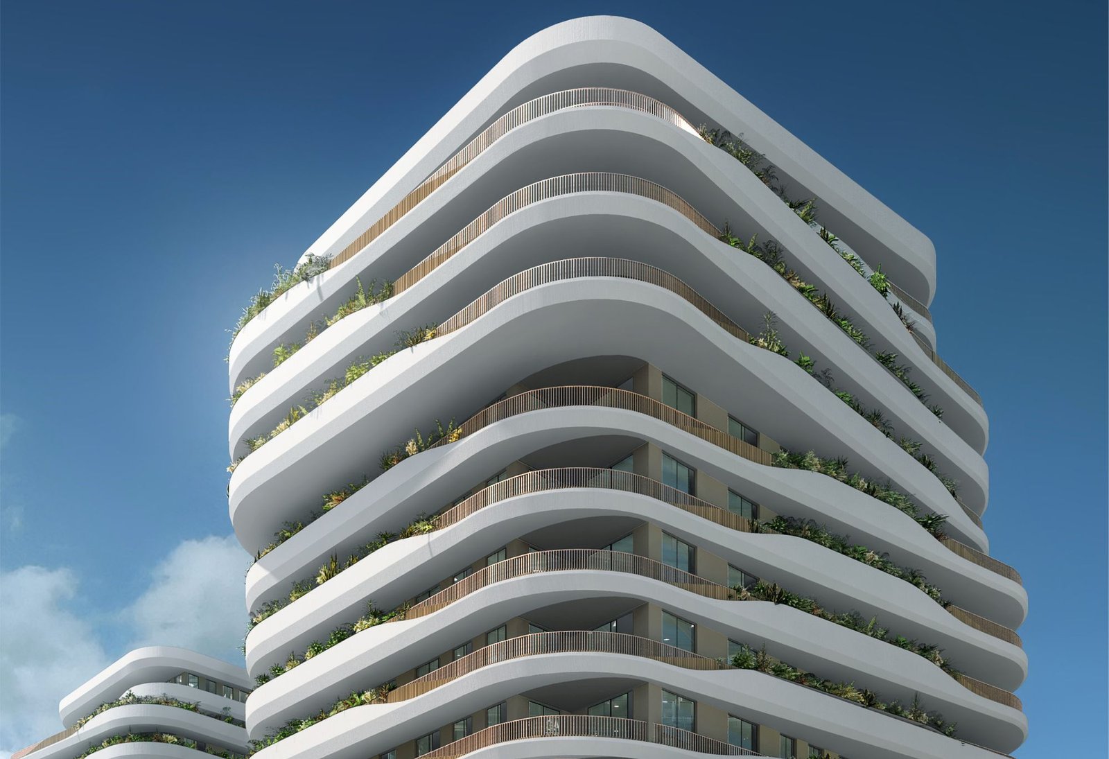La matérialisation d’un socle, de podiums et d’émergences ainsi que les variations périmétrales des balcons filants qui leur font écho, expriment une silhouette chaloupée, à la fois douce et dynamique, homogène et séquencée.