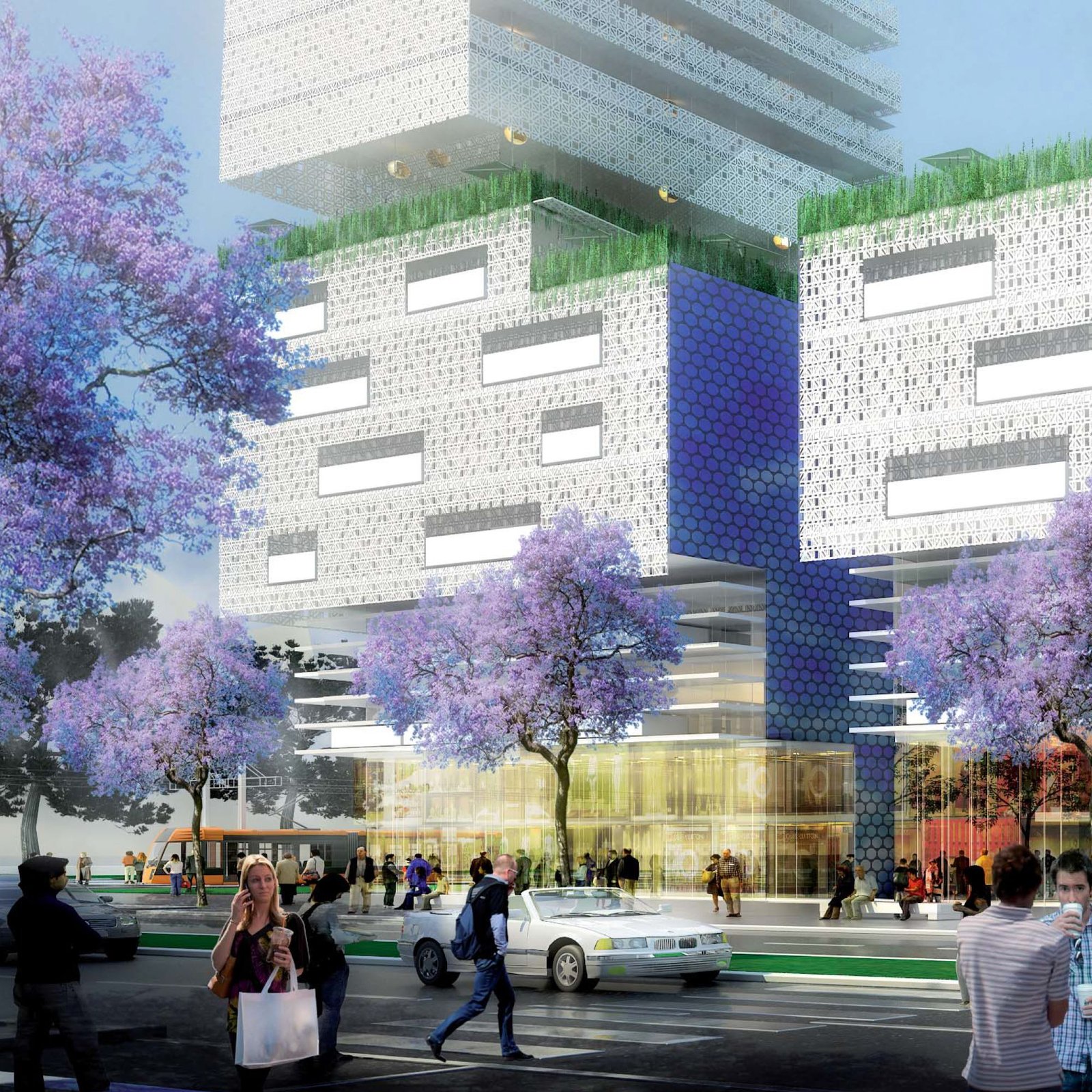 Côté rue, grâce à son épaisseur, le bâtiment principal assure l’intimité de l’ilôt vis-à-vis des boulevards fréquentés (boulevard de l’Aéropostale et boulevard du Grand Théâtre). Réinterprétation des Ksars aux enceintes continues et aux tours d’observation, le projet se démarque aussi par de hautes émergences.
