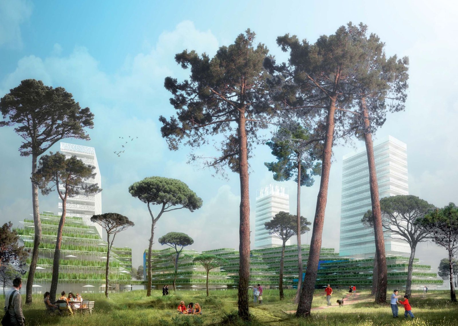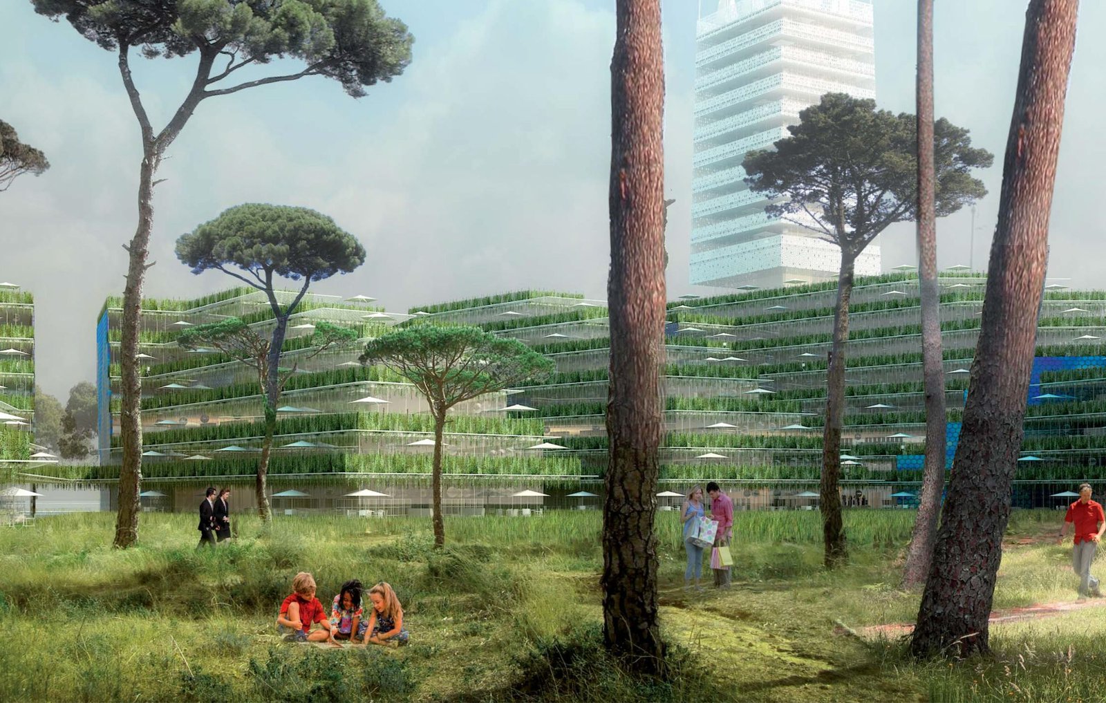 Celles-ci, décollées du socle paysager, donnent à l’édifice une allure aérienne. Leur disposition permet aux ilôts situés derrière de profiter aussi de vues sur le parc