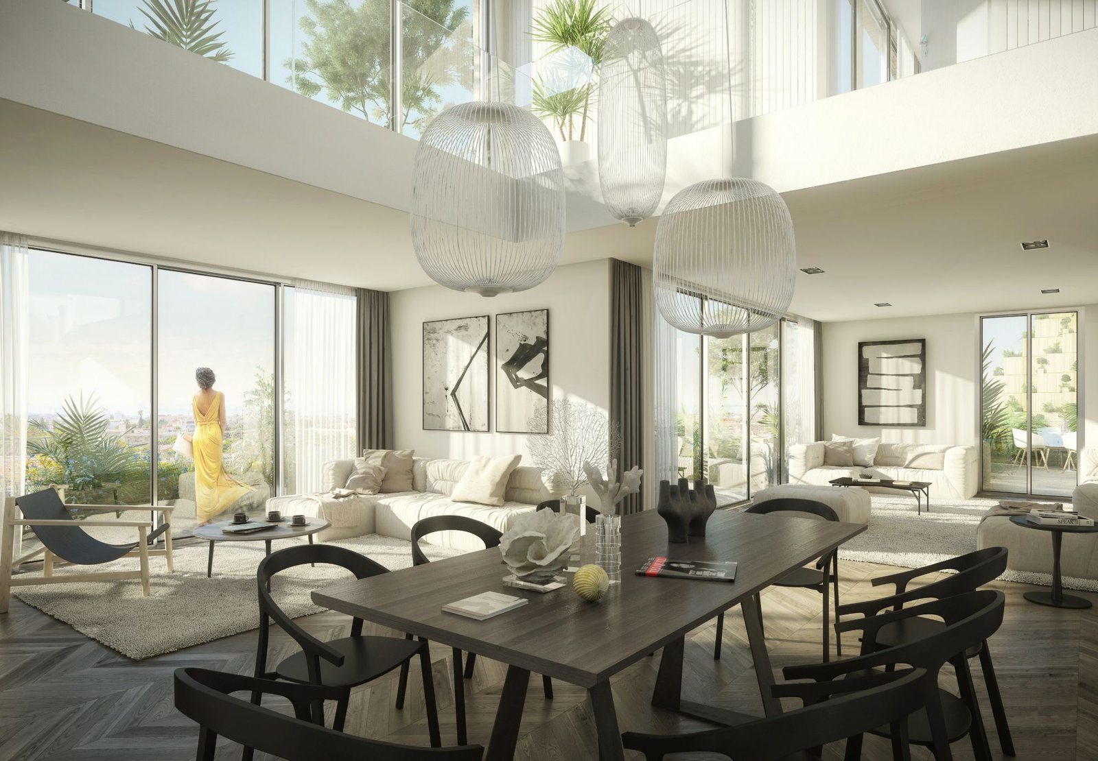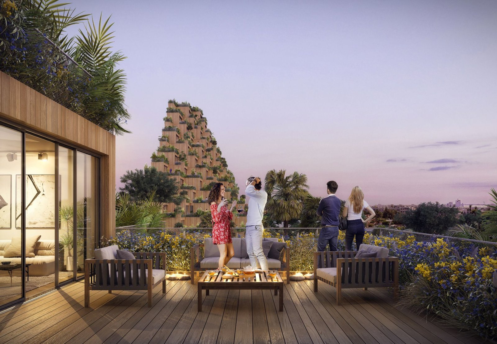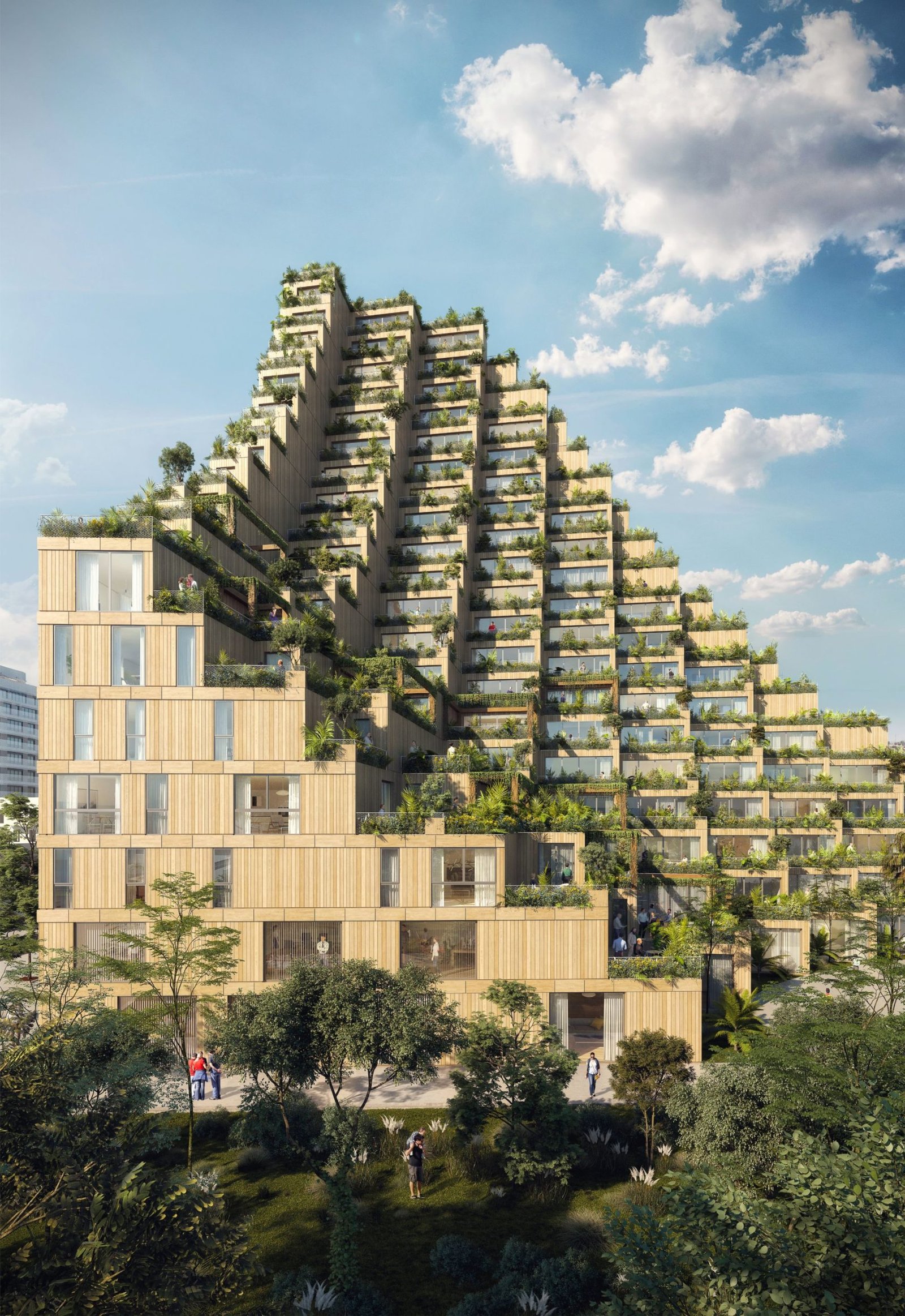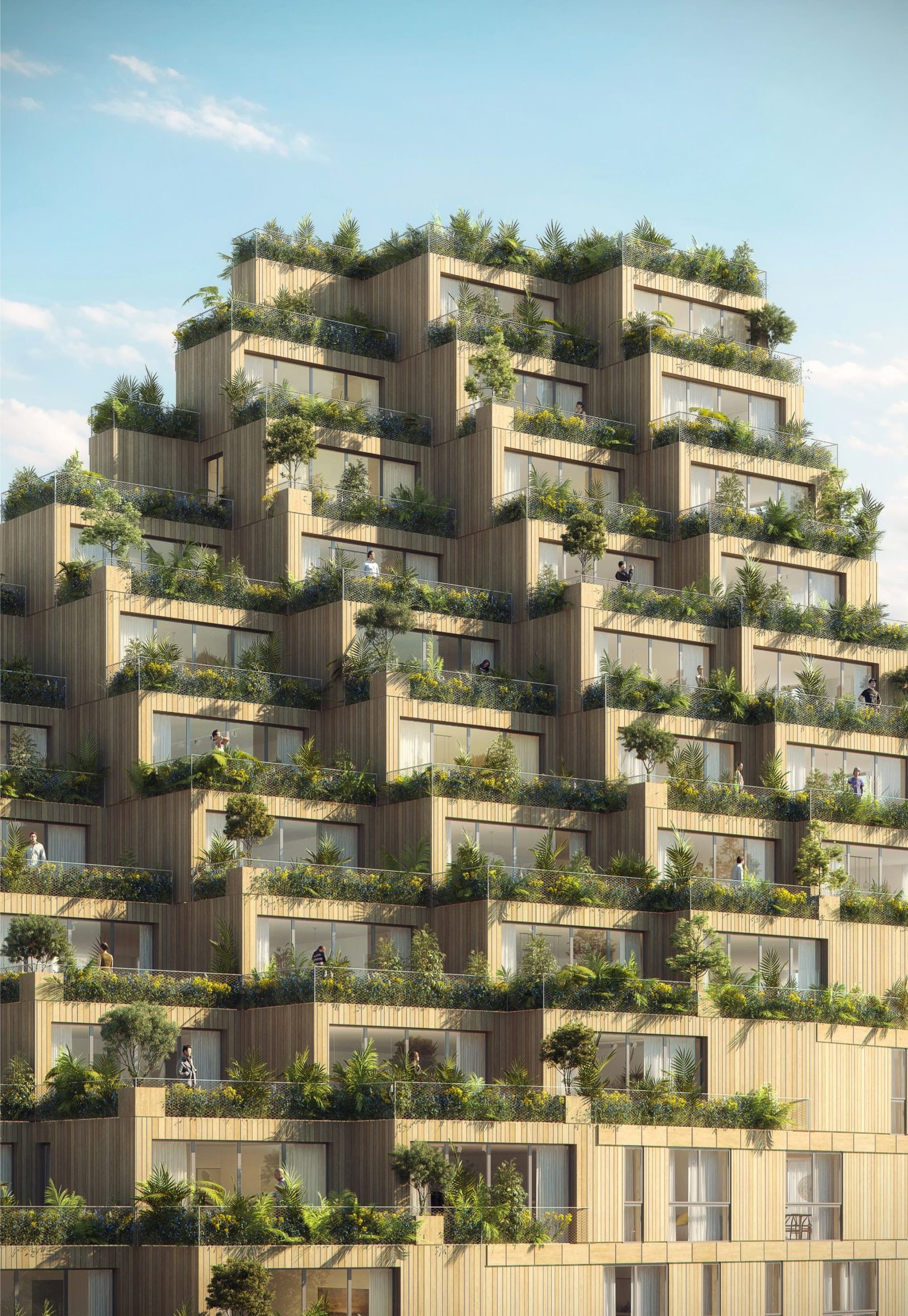 Le bâtiment ainsi sculpté dans une géométrie paramétrée favorise les apports lumineux, élimine les vis-à-vis et offre un panorama dégagé à tous les appartements. Les logements s’insèrent comme des maisons de plain-pied sur un relief verdoyant. Des terrasses vertes s’installent en gradin telles des restanques sur une colline et permet de bénéficier de jardins privatifs généreux et intimistes. Cette part belle au végétal donne le sentiment d’un prolongement direct des jardins frais de l’ilot 128. Une continuité naturelle du parc vers le bâtiment qui renforce cette idée d’habiter une colline.