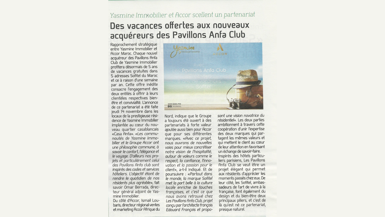 Titre : Yasmine Immobilier et Accor scellent un partenariat. Des vacances offertes aux nouveaux acquéreurs des Pavillons Anfa Club